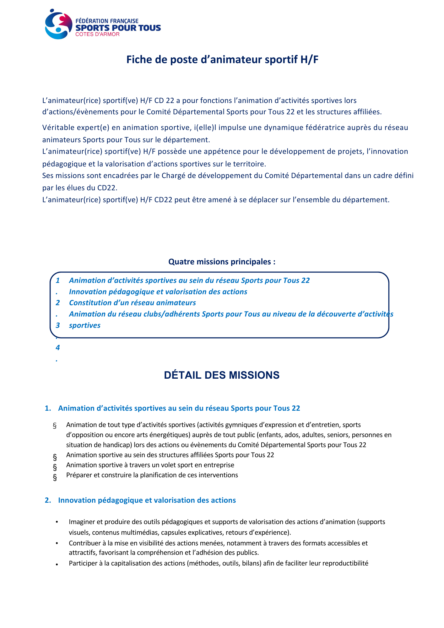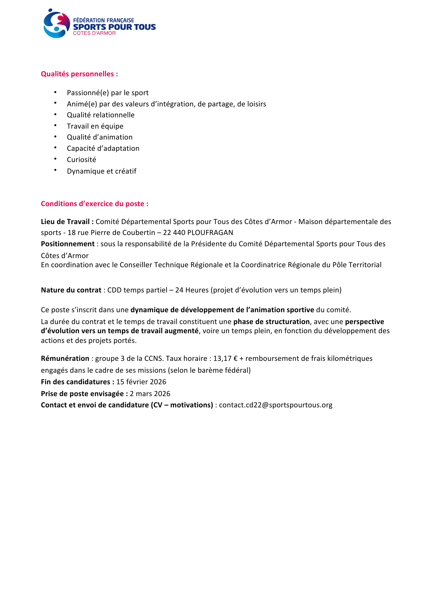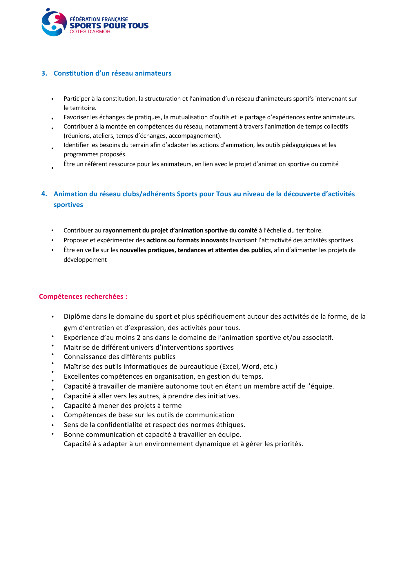 Le Comité Départemental Sports pour Tous des Côtes-d’Armor recrute !