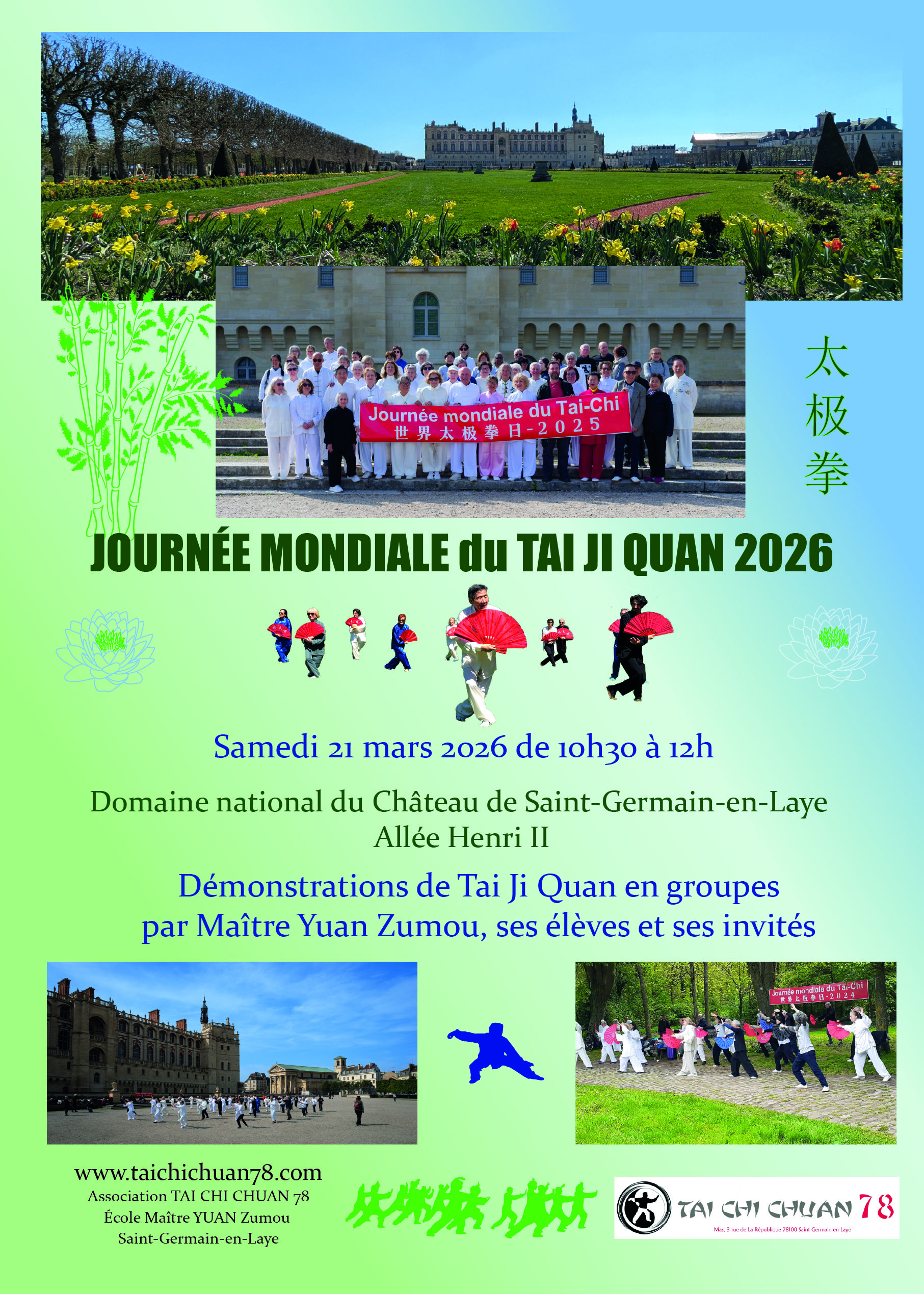 À cette occasion, Maître YUAN Zumou et l’association TAI CHI CHUAN 78 – École Maître YUAN Zumou proposent de poursuivre la tradition d’une célébration en plein air, dans le cadre exceptionnel du Domaine national du Château de Saint‑Germain‑en‑Laye